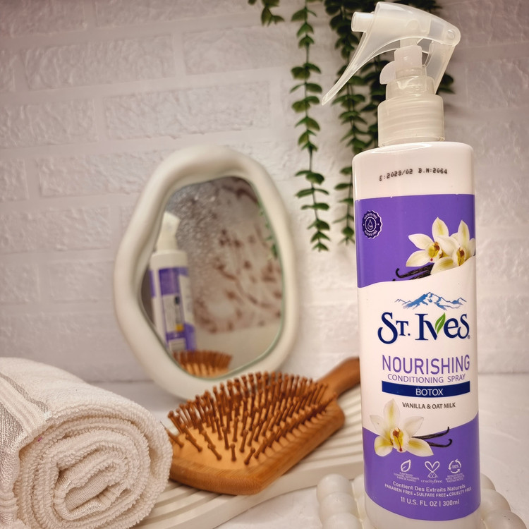 این محصول اسپری 10 کاره (محلول نرم کننده موی سر-افشانه)، فری سولفات و پارابن از برند ST.Ives در سری نورشینگ (تغذیه کننده) بوده که از مواد بوتاکس استفاده شده است. مواد بوتاکس مو حاوی روغن خاویار، ویتامین B5، ویتامین E و کلاژن است. وظیفه اصلی بوتاکسِ مو، مرطوب کردن، تغذیه کردن، ترمیم و احیای مو و بازگردانی آن به حالت اول است. علاوه بر آن، استفاده از این محصول، مو ها را براق می کند و باعث صافی مو و از بین بردن وز آن می شود. مزیت اصلی استفاده از بوتاکس این است که به وسیله ان می توان موخوره را تا حد زیادی درمان کرد. منظور از درمان موخوره، جلوگیری از ایجاد مجدد موخوره در نوک موهاست. میدانید که دلیل اصلی به وجود آمدن موخوره کم آبی مو و عدم رسیدگی به آن است. این محصولات سلامت را به موهای شما بازمیگردانند. یکی از بزرگترین مزایای استفاده از اسپری 10 کاره بوتاکس برای موها این است که یک روش کاملاً ارگانیک برای احیای مو های آسیب دیده است و حتی می تواند برای جلوگیری از ریزش مو یک راه مناسب باشد.